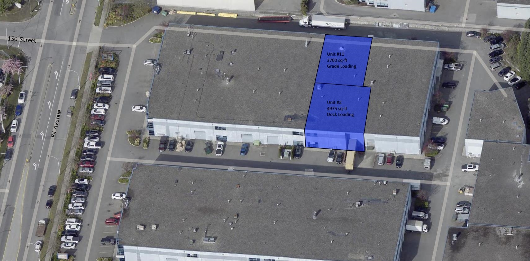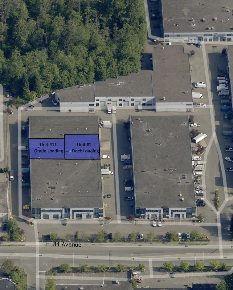 Prime location for Lease in Newton, this warehouse comes with dock Loading and 24' clear ceilings, alternatively, you can purchase unit 11 with grade loading. Lease both units together which may allow drive through capabilities. Total square footage of both units combined is 8675 sq-ft. High ceiling, ample parking, plenty of power and centrally located in desirable Golden Gate Business Park on 84th Avenue in Newton industrial zone. Built in 2001 this plaza is well planned and features large driveways to support trucks and containers alike. This unit is located in one of the front building facing 84th Avenue.